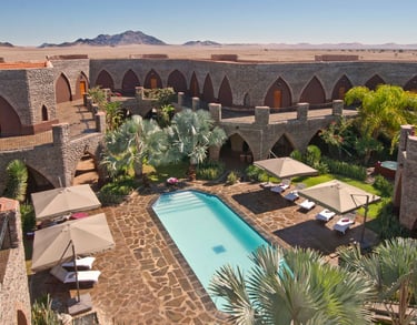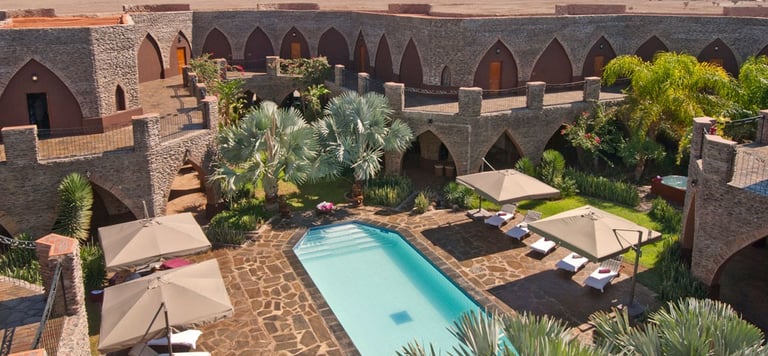 Un lodge de luxe qui peut surprendre au milieu du désert avec une architecture entre fort en pierre et palais marocain! L'hôtel offre une "Sky room" pour observer les étoiles et des beaux jardins pour profiter d'un séjour ultra relaxant après tous les campings précédents :)